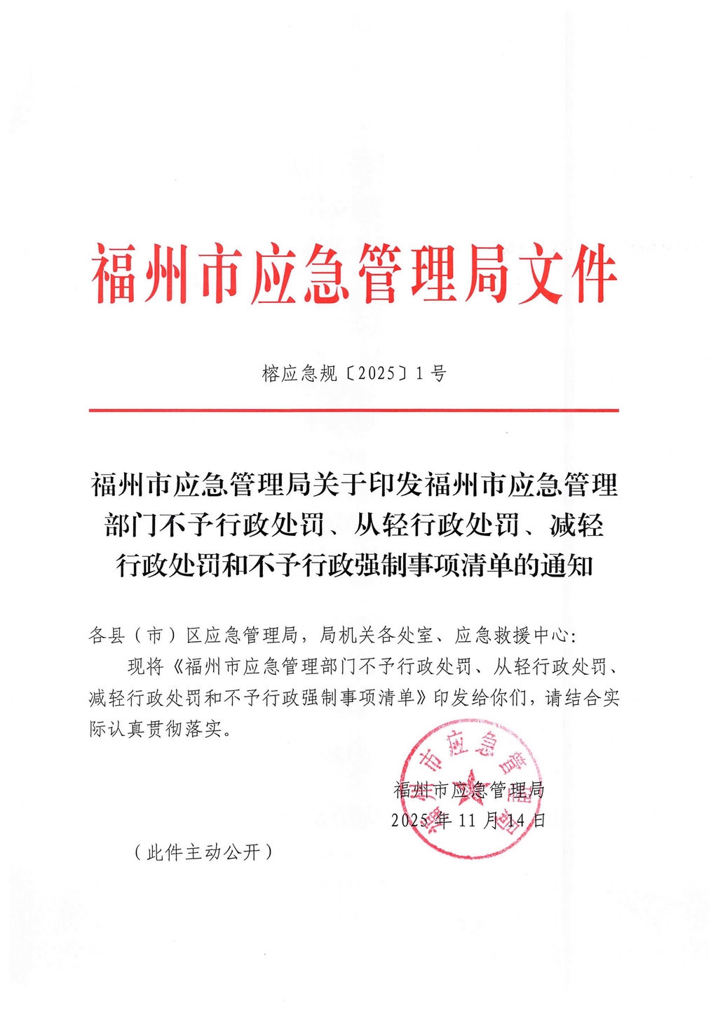 福州市应急管理局关于印发福州市应急管理部门不予行政处罚、从轻行政处罚、减轻行政处罚和不予行政强制事项清单的通知